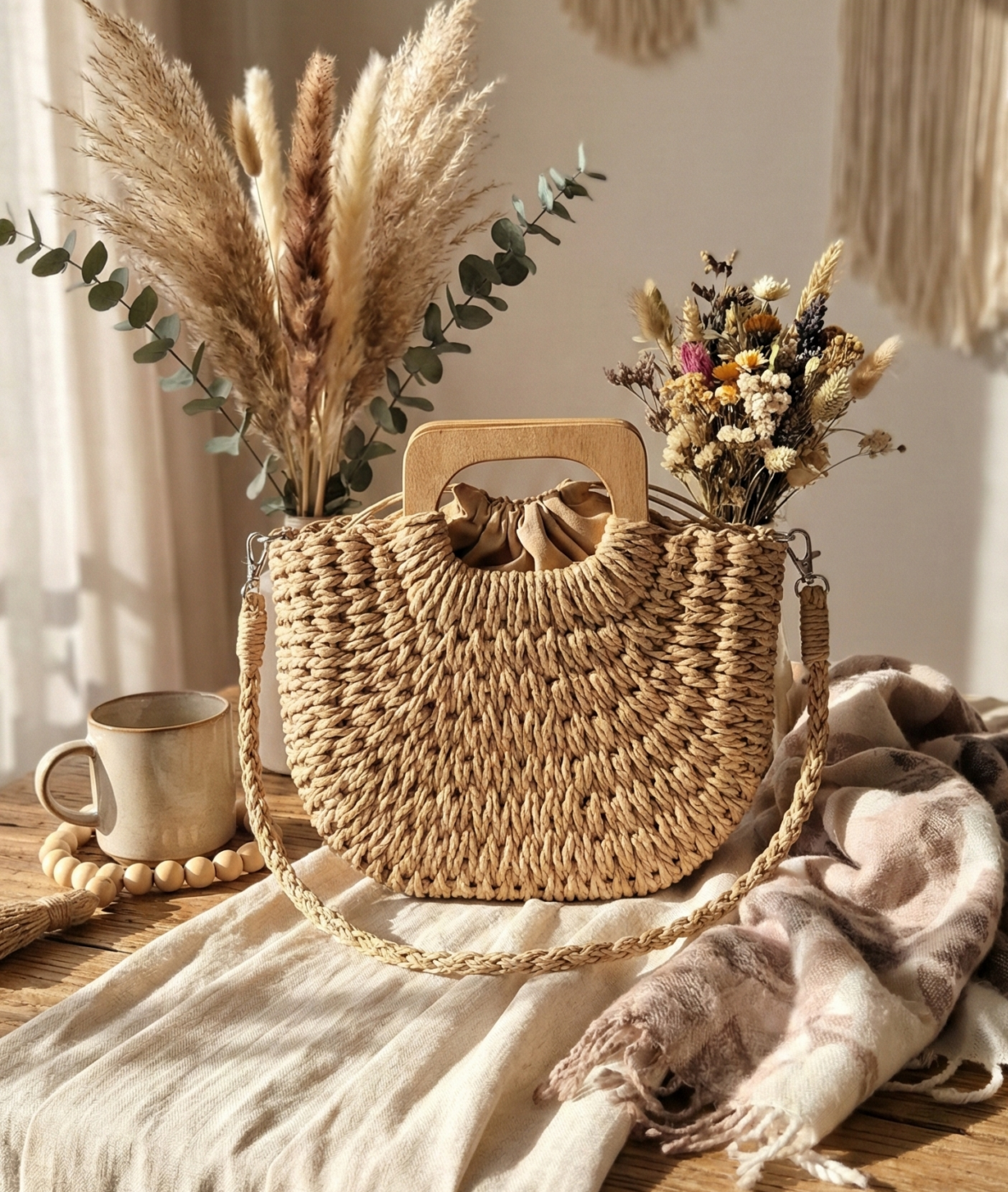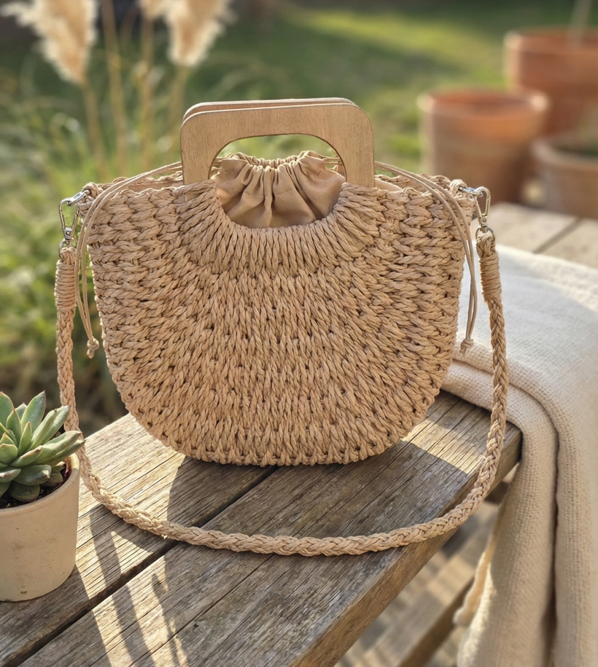 W tej torebce mieszka dusza naturalności. Każde włókno opowiada historię słońca i deszczu, a drewniana rączka – wypolerowana dotknięciami czasu – nosi w sobie ciepło żywego drzewa. To nie tylko dodatek; to manifest wolności dla tych, którzy noszą swój styl jak pieśń.