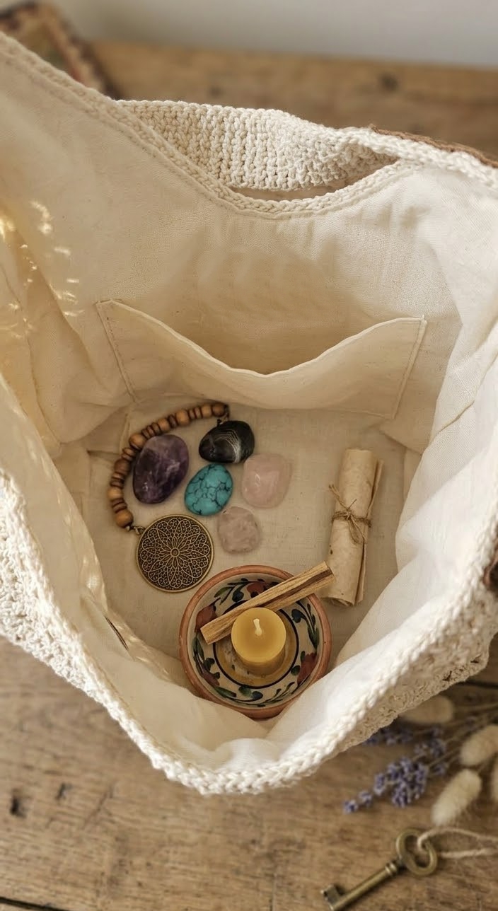 Naturalne materiały splecione w małą perfekcję. Środek – najprawdopodobniej miękka bawełna – chroni to, co nosisz. Guzik zabezpiecza, nie komplikując. Jedna krótka rączka, zaledwie 24 centymetry, mówi jasno: jestem do noszenia w dłoni, blisko serca, blisko skóry.